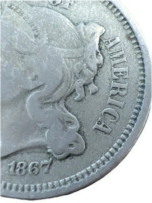 The 1867 3 Cent Nickel Piece A1364 is a coin minted in Philadelphia in the United States. It is composed of nickel and has a denomination of 3 cents. This circulated coin is a business strike, meaning it was produced for general circulation rather than as a collectible. Although it is uncertified, it holds historical value as a piece of US coinage from the late 19th century.