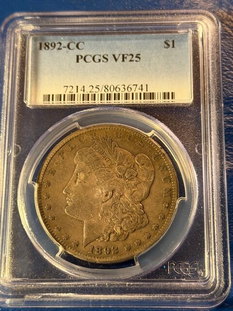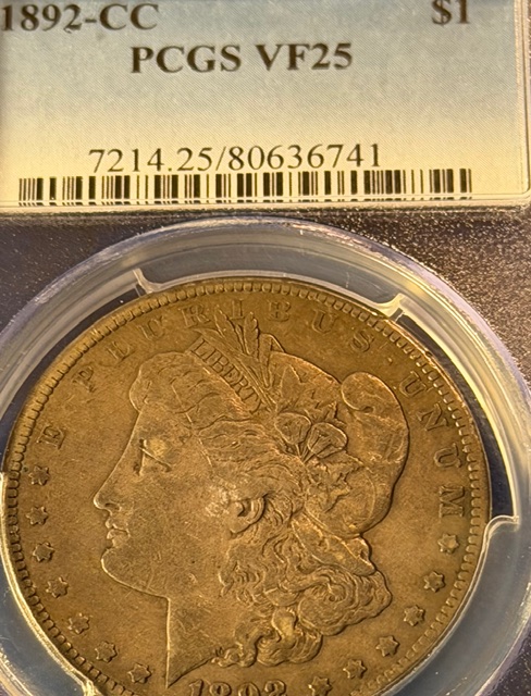 PCGS-certified 1892-CC Morgan Silver Dollar graded Very Fine 25 (VF25). Struck at the historic Carson City Mint, this classic U.S. silver dollar features Liberty on the obverse and a heraldic eagle with outstretched wings on the reverse. Composed of 90% silver, the coin shows moderate, even wear with strong remaining detail in Liberty’s hair and the eagle’s feathers. A desirable Carson City issue with lasting collector appeal and Old West history.