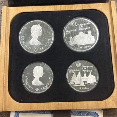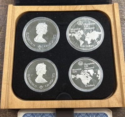 The 1976 Canada Olympic Series I Geographic 4 Coin Proof Set is a commemorative collection of uncirculated .925 silver coins from Canada. This set includes four coins that are certified as original and come in their original box with a Certificate of Authenticity. Each coin is a valuable piece of Canadian numismatic history, making this set a desirable addition to any coin collector's portfolio.