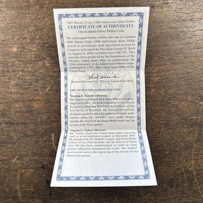The 2005 Marines Corps 230th Anniversary Uncirculated Silver Dollar is a commemorative coin issued by the U.S. Mint to celebrate the 230th anniversary of the Marine Corps. This silver dollar has a fineness of 0.9 and was minted in Philadelphia. The coin is uncirculated, making it a desirable piece for collectors of modern US silver coins. With its unique design and historical significance, this silver dollar is a valuable addition to any coin collection.