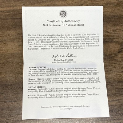 The 2011-W September 11 Proof Silver National Medal is a commemorative coin minted by the U.S. Mint to honor the September 11 attacks. This medal is made of .999 fine silver, with a total precious metal content of 1 ounce. It features a proof strike type and comes with a Certificate of Authenticity from the government. This limited edition coin is a powerful symbol of patriotism and resilience, making it a valuable addition to any coin collection or investment portfolio.