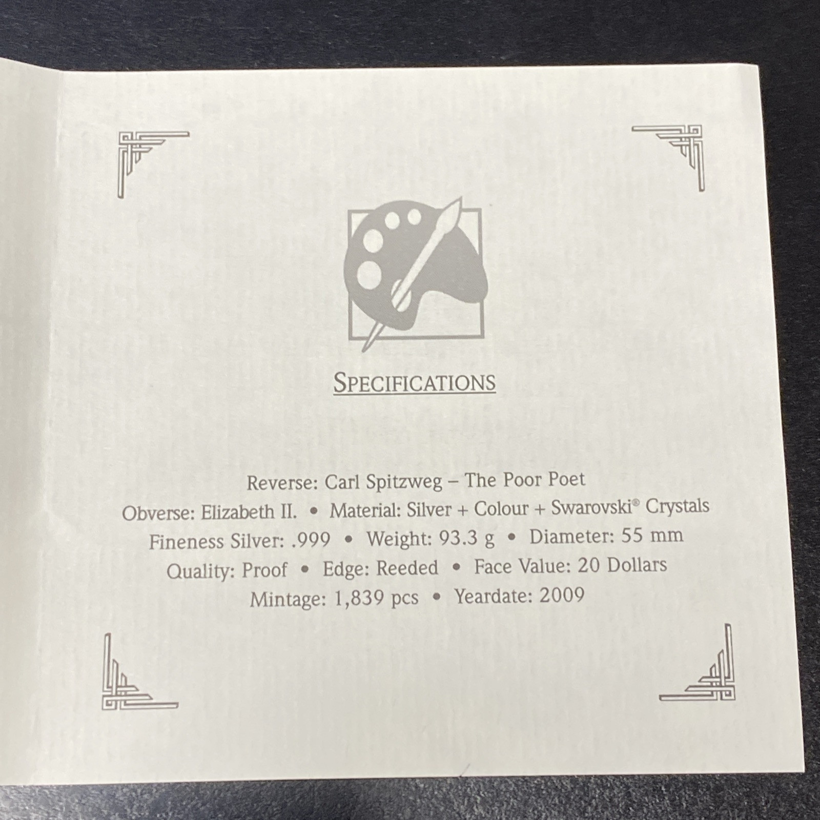 The product is a 2009 Cook Islands silver coin with a denomination of $20. It features a design based on the painting "The Poor Poet" by Carl Spitzweg, adorned with Swarovski crystals. The coin has a fineness of 0.999 and weighs 3 oz. It was minted in Australia and is uncertified.