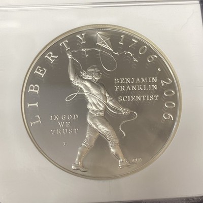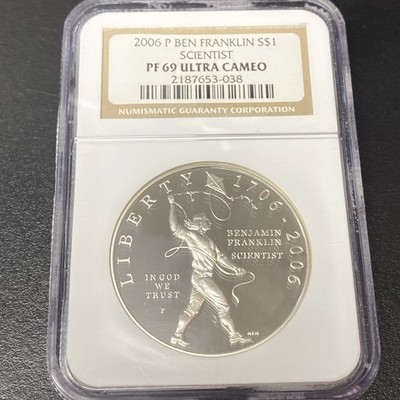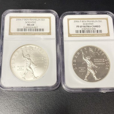The product is a set of 2 2006-P $1 Ben Franklin Scientist Proof Silver Dollars certified by NGC as PF69 and MS69. These uncirculated coins are composed of modern silver with a fineness of 0.9 and were minted in Philadelphia. The coins feature a commemorative design of Ben Franklin Scientist and are part of the United States commemorative coin series. The certification numbers for these coins are 2187653-038 and 2187653-027.