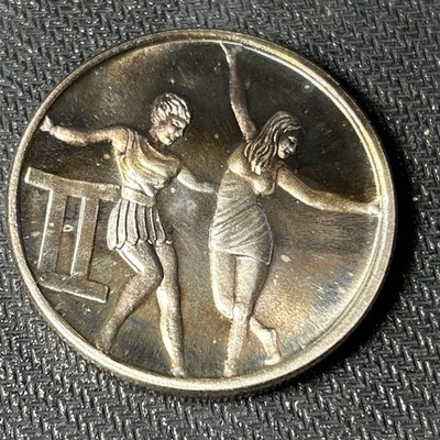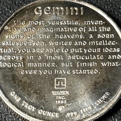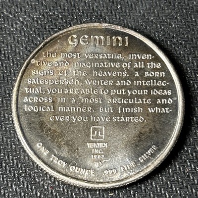 The Vintage TenTex 1 oz. Gemini Zodiac Sign Twins .999 Fine Silver Round from 1983 is a highly collectible and valuable piece made of pure silver. This unique round features intricate designs representing the zodiac sign of Gemini, making it a special addition to any collection of precious metals. The high purity of .999 fine silver ensures its quality and rarity, making it a sought-after item for both collectors and investors. Produced by TenTex in the United States, this silver round is a timeless piece that holds both intrinsic and sentimental value.